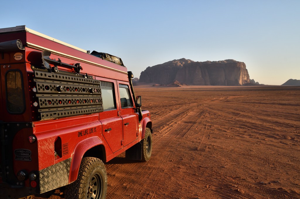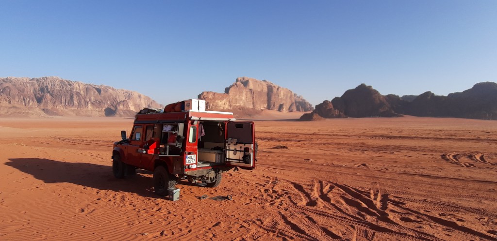 Der Kühlschrank wird gefüllt, endlich wieder humane Preise. Ich tanke, 1,25€ der Liter, die Hälfte des israelischen Literpreises. Voll bitte, randvoll! Soll reichen bis Saudi Arabien. Ich kann es kaum erwarten, erster Gang, ab nach Wadi Rum. Nach etwas mehr als zwei Stunde steh ich am Visitors gate. 25JD (ca 33€), und ab geht es. Auf den Spuren von Lawrence von Arabien. Die Sonne senkt sich über dem Horizont. Einige Berge sind bereits im Schatten, andere leuchten knallig orange.