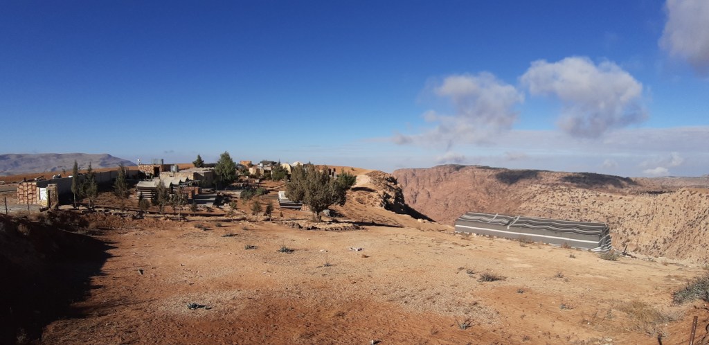 Nach zwei Tagen Wadi Rum geht es in den Norden. Platte Hochebene. Ich will in den Dana Nationalpark. Direkt am Stellplatz bricht das Plateau auf und ich stehe mit der Hecktür direkt an der Schlucht. „Welcome to Jordan“ ist die Antwort jeder Bitte an den Platzwirt. Die Arbeit machen ausnahmslos Jeminiten, männlich. Sie machen die Wäsche, die Hütten sauber, servieren beim Essen. Tee gibt es pausenlos, sobald man sich dem zentralen Bereich des Platzes nähert. Inklusive sind Frühstücks- und Abendbüffet. Abwechslungsreich, würzig und sehr lecker. Die Dana Gegend ist ein Wanderparadies, schroffe Felsformationen, ausgetrocknete Flußläufe und karge Ebenen. Auch ein wunderbarer Ort der Hitze zu entfliehen. Hier auf 1200m Höhe hab ich mir abends schon mal die Standheizung angemacht.