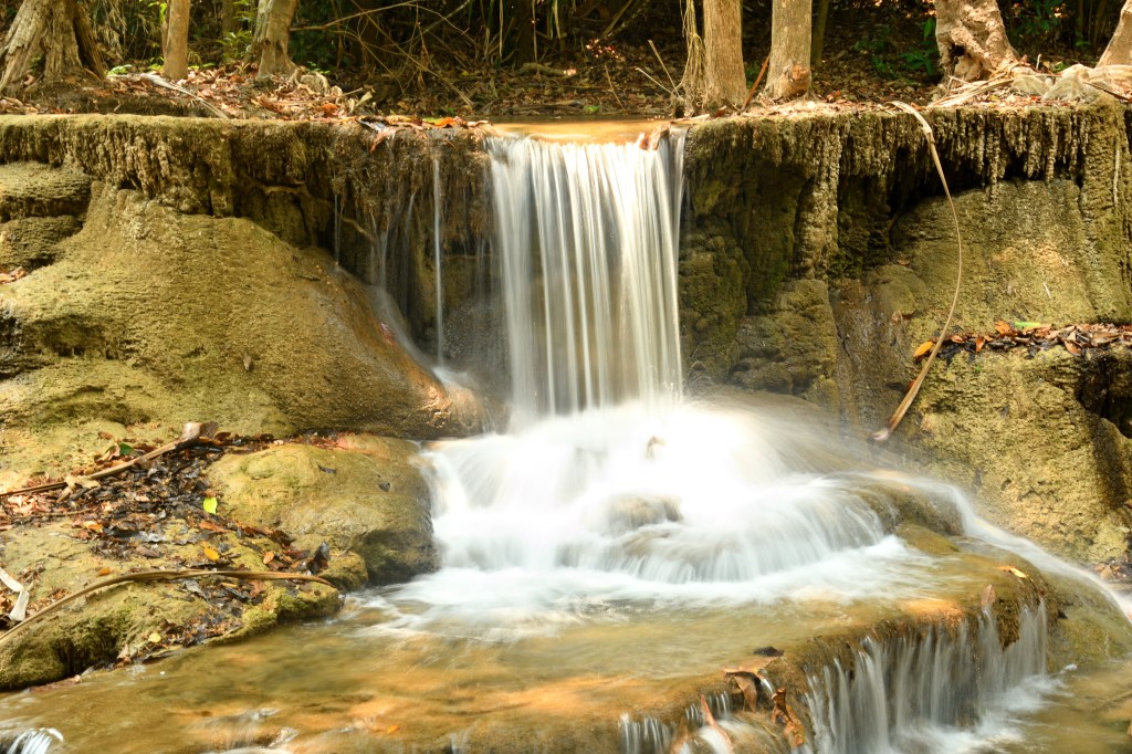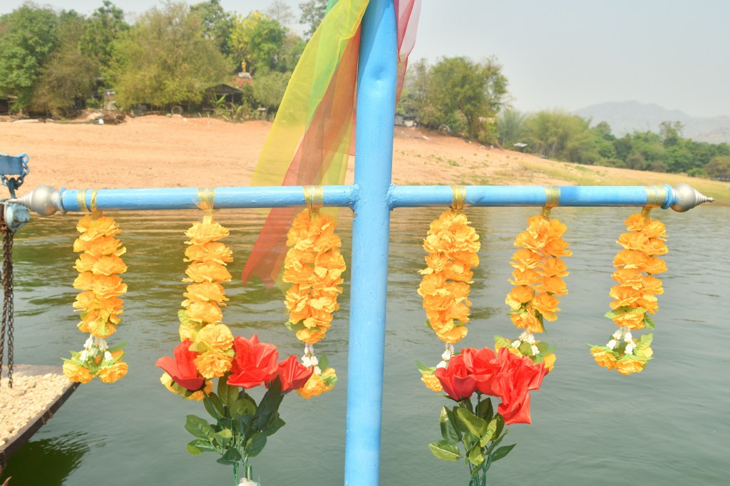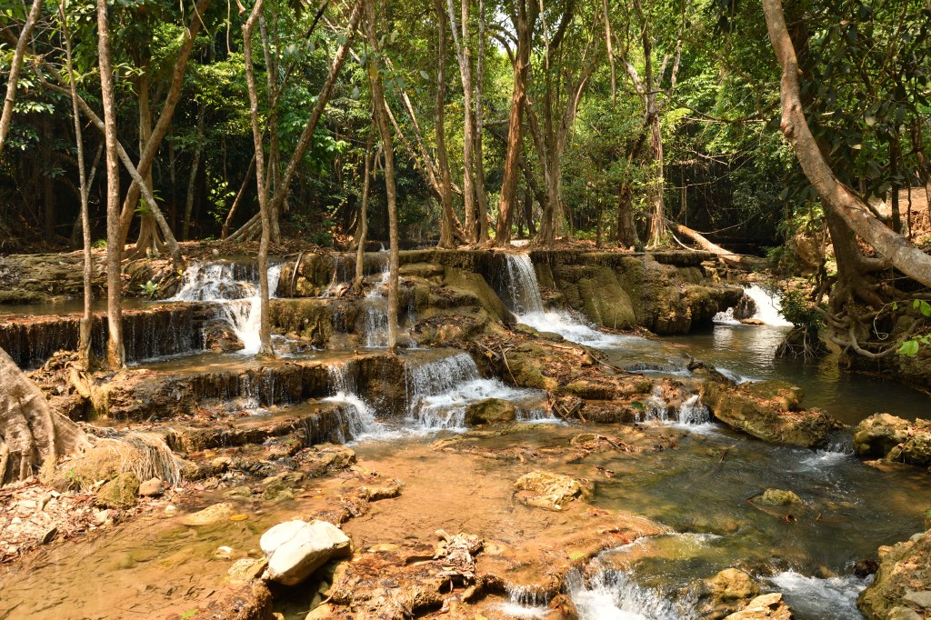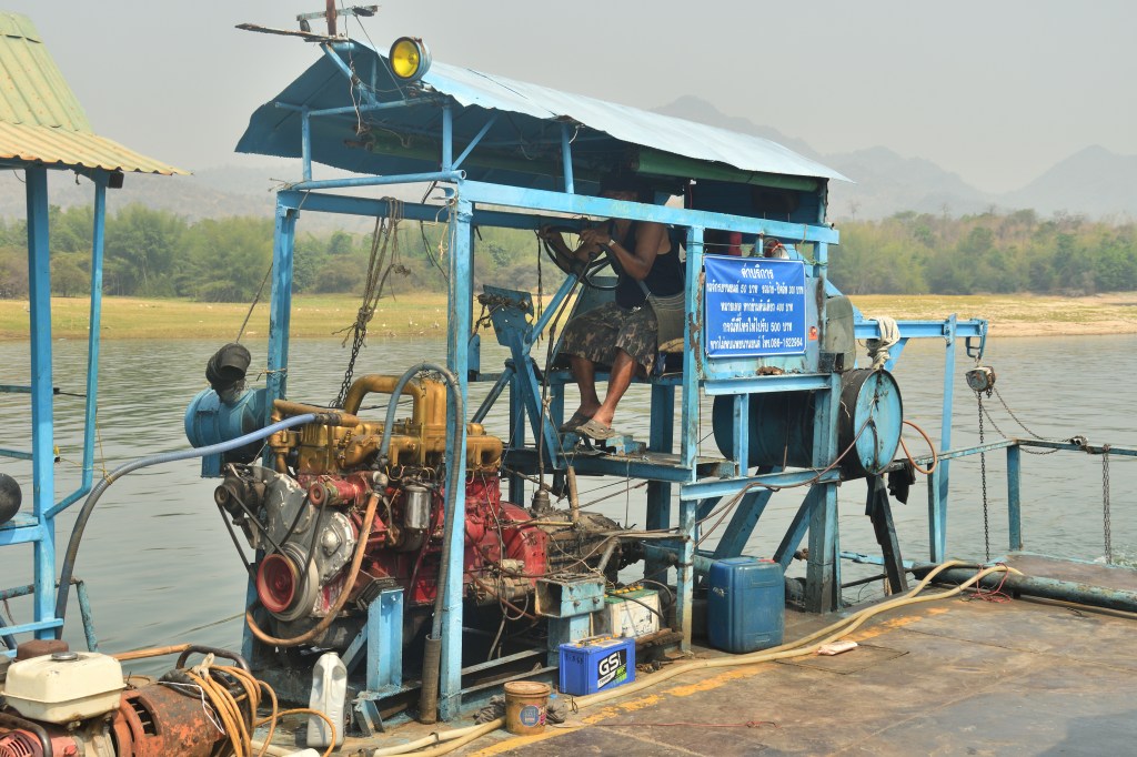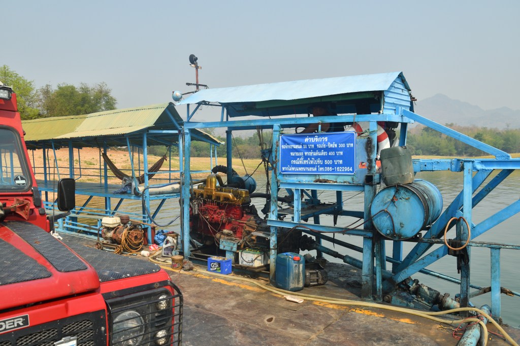 Im Erawan Nationalpark habe ich mich 3 Tage aufgehalten. Eine echt anstrengende, ewig lange Bergauffahrt. Der 7 stufiger Wasserfall, über mehrere hundert Meter verteilt, ist unbedingt einen Besuch wert, und rechtfertigen die Strapazen. Es sind Fälle wie gemalt – irre. Für den Weg runter wähle ich eine nicht sehr befahrene Alternative, die mich mit Fähren über Buchten des Sinakharin Stausees bringt. Nicht sehr befahren endet dann bald in kilometerlangen Schotterpisten, zu Anfang noch von mächtigem Bambus eingerahmt. Ein in die Fahrbahn stehender Ast hat vermutlich die Spannschelle des Aufstelldaches von der Karosse gerissen. Das stelle ich aber erst am Abend fest. Eine Lösung für das erste Problem hatte ich schnell zu Stelle.