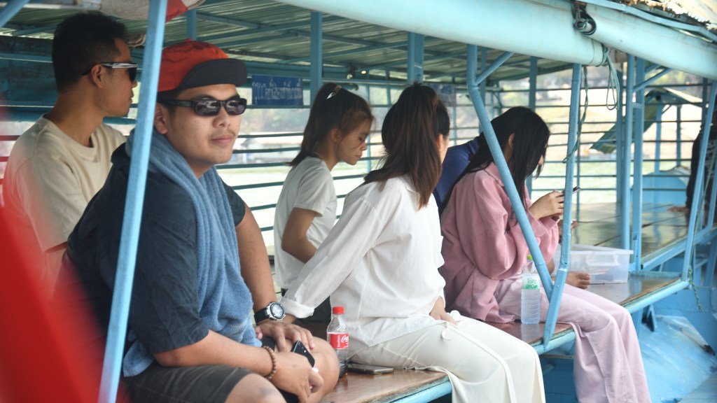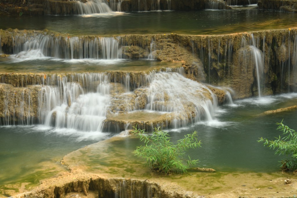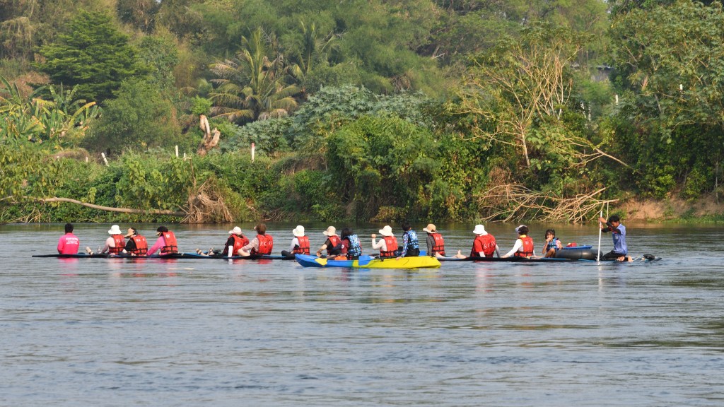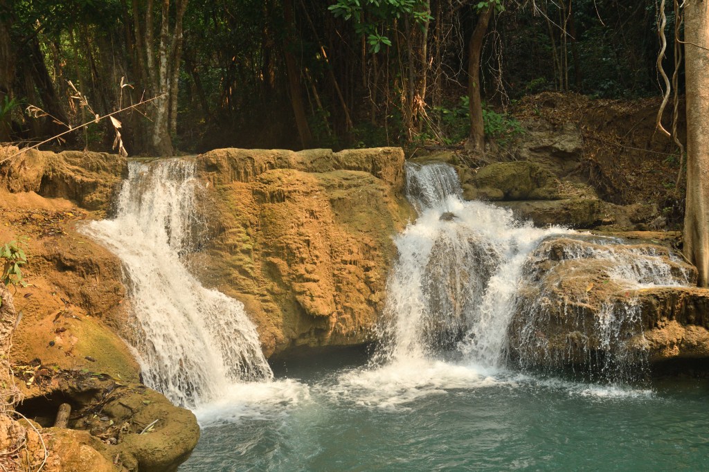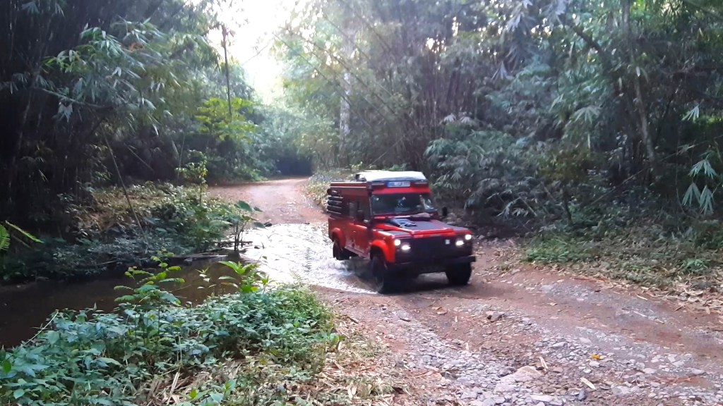 Im Erawan Nationalpark habe ich mich 3 Tage aufgehalten. Eine echt anstrengende, ewig lange Bergauffahrt. Der 7 stufiger Wasserfall, über mehrere hundert Meter verteilt, ist unbedingt einen Besuch wert, und rechtfertigen die Strapazen. Es sind Fälle wie gemalt – irre. Für den Weg runter wähle ich eine nicht sehr befahrene Alternative, die mich mit Fähren über Buchten des Sinakharin Stausees bringt. Nicht sehr befahren endet dann bald in kilometerlangen Schotterpisten, zu Anfang noch von mächtigem Bambus eingerahmt. Ein in die Fahrbahn stehender Ast hat vermutlich die Spannschelle des Aufstelldaches von der Karosse gerissen. Das stelle ich aber erst am Abend fest. Eine Lösung für das erste Problem hatte ich schnell zu Stelle.