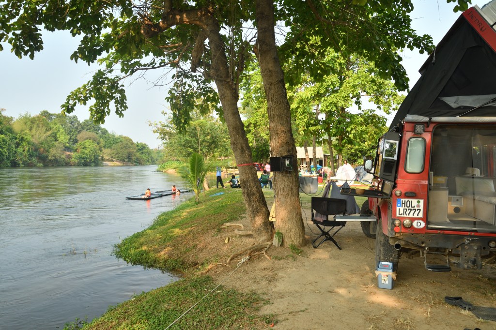 Der Ort an dem ich das festgestellt habe, war ebenso malerisch wie die Wasserfälle. Nicht weit vom Eingang des Nationalparks entfernt. Ein Campingplatz am Fluss Khwae Yai. Himmlisch. Der Besitzer eine Seele von Mensch. Rasen, Schatten, Strom und alles gepflegt. Das Wasser herrlich erfrischend. Und die Sonne geht direkt über einem Tempel auf, der nur 100m weit weg ist. Bitte schön, was will man mehr?