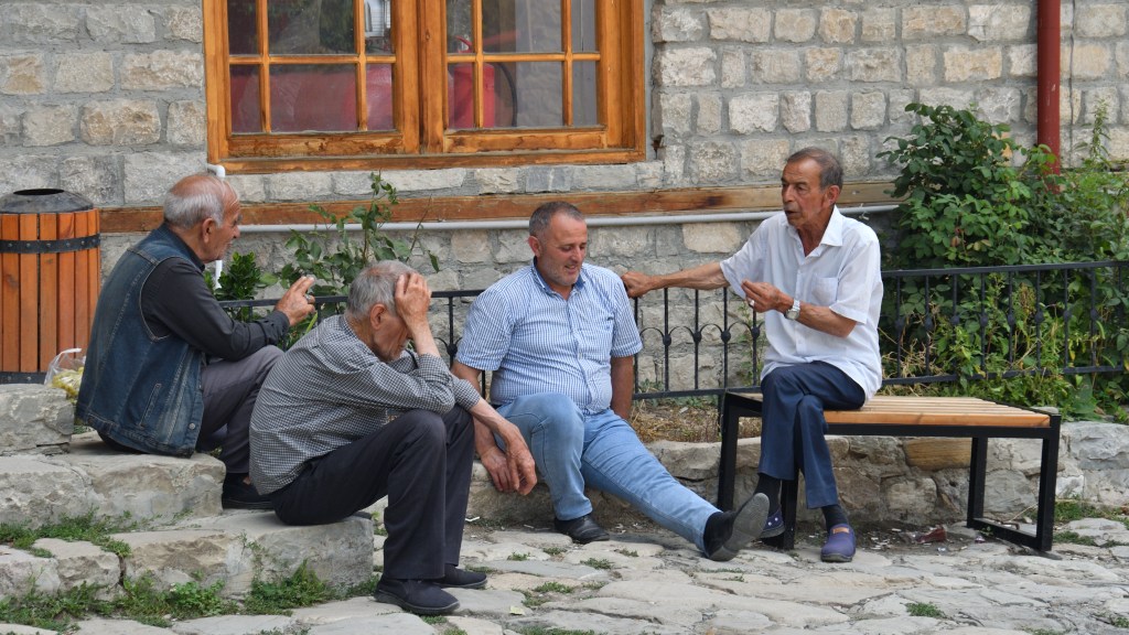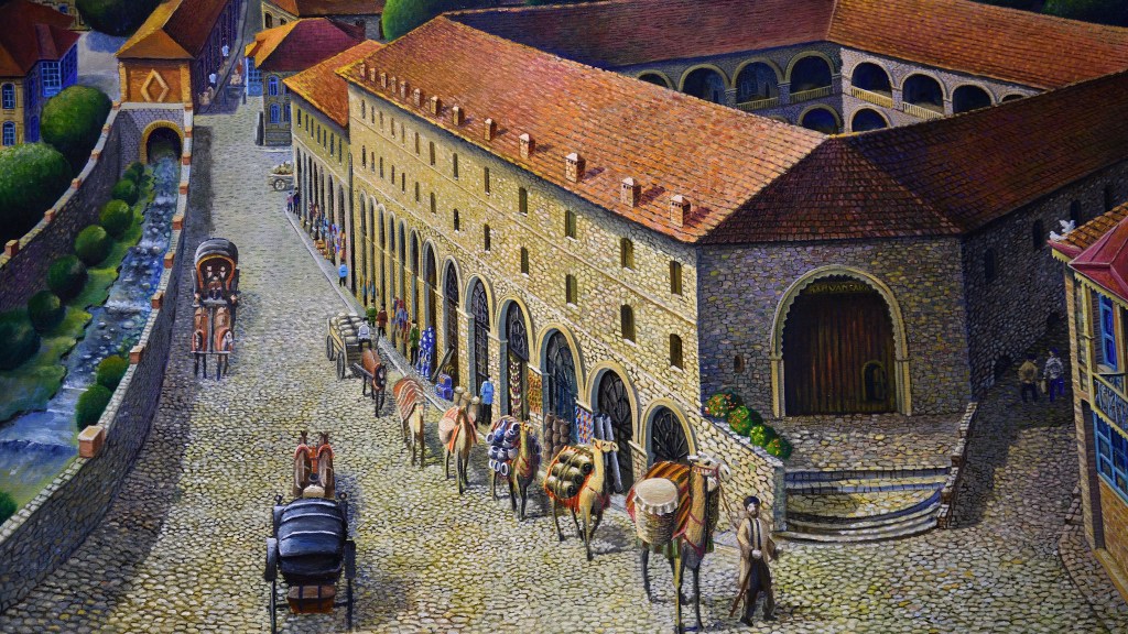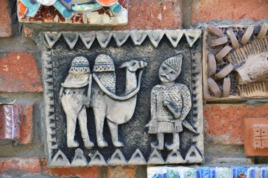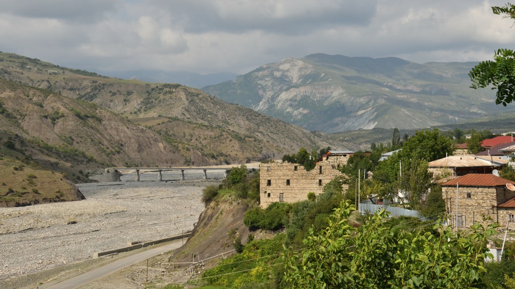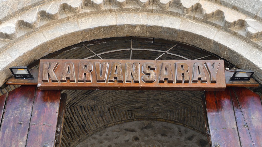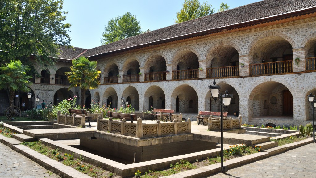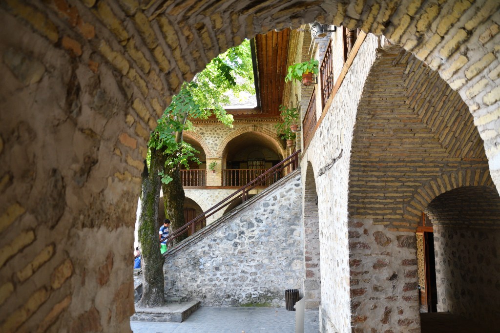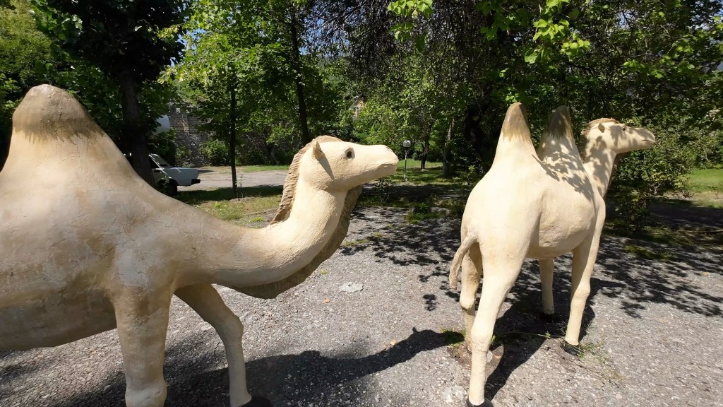 Auf der Strecke nach Georgien liegt Seki, ein größerer Ort mit historischem Stadtkern. Ich mache vorher noch einen Abstecher in ein Skigebiet und bin erst am Abend dort. Einmal durch, den Hügel rauf zu einem Restaurant mit Camping, 5€ die Nacht für einen schattigen Platz. Der Ort hat einiges zu bieten. Die alte Karawanserei ist ein wichtiger Baustein für mein Bild der Seidenstraße. Dicke Mauern, gewaltige Abmessungen, waren sie der Schutz für die Händler mit ihren Tieren und den Waren für die Nacht. 1a restauriert, kann man sich hier gut vorstellen, wie es früher gewesen ist. Und im Innenbereich die Skulpturen von Kamelen. Hier schießt mir plötzlich der Gedanken in den Kopf, dass der Handel und die Seidenstraße nur existierten, weil diese Tiere in der Lage waren, die Waren zu tragen und in der Wüste zu überleben. Da die Seidenstraße nicht nur ein Handelsweg war, sondern maßgeblich zur Entwicklung der Kulturen in Ost und West beigetragen hat, steht die Frage im Raum, wie sich die Geschichte ohne Kamele abgespielt hätte. Spannender Gedanke ohne Antwort.