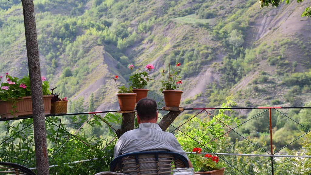 Den schönen Abschluss des Tages verbringe ich einem Teehaus mit schönem Blick über ein mächtiges Flussbett, das wohl vorwiegend zur Schneeschmelze gewaltige Wassermassen führen muss, die Breite lässt darauf schließen.