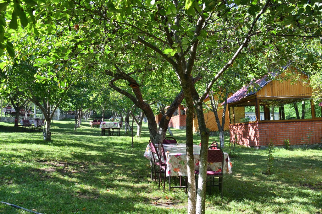 Ein schattiges Plätzchen an einem Bach, Himbeeren zur direkten Verkostung am Busch. Die Nacht ist kühl, so hab ich es mir gewünscht. Entlang der Straßen findet man unter den Eichen schattige Restaurants. Tische und Stühle stehen verteilt unter den Bäumen. Einige haben kleine Hütten bei schlechtem Wetter. Die Küche ist der zentrale Ort hinter der Einfahrt. Sehr angenehm.