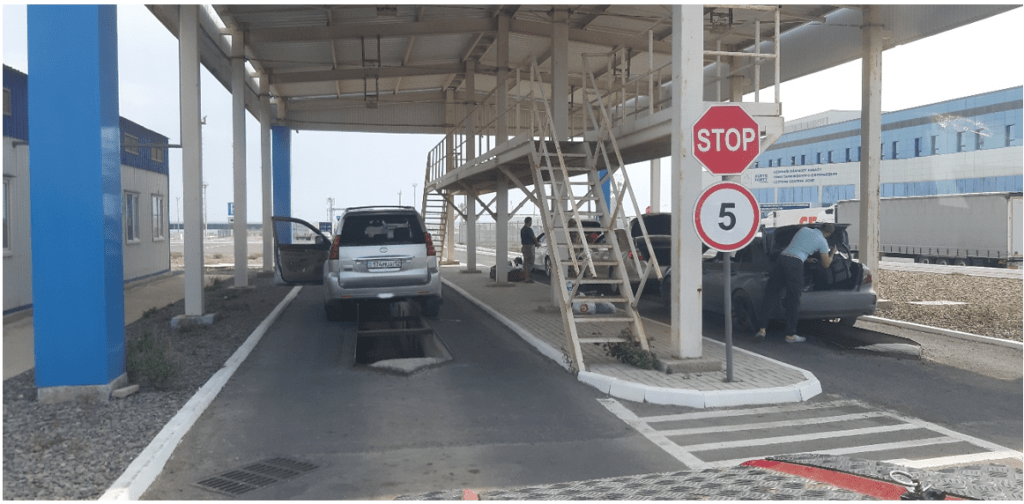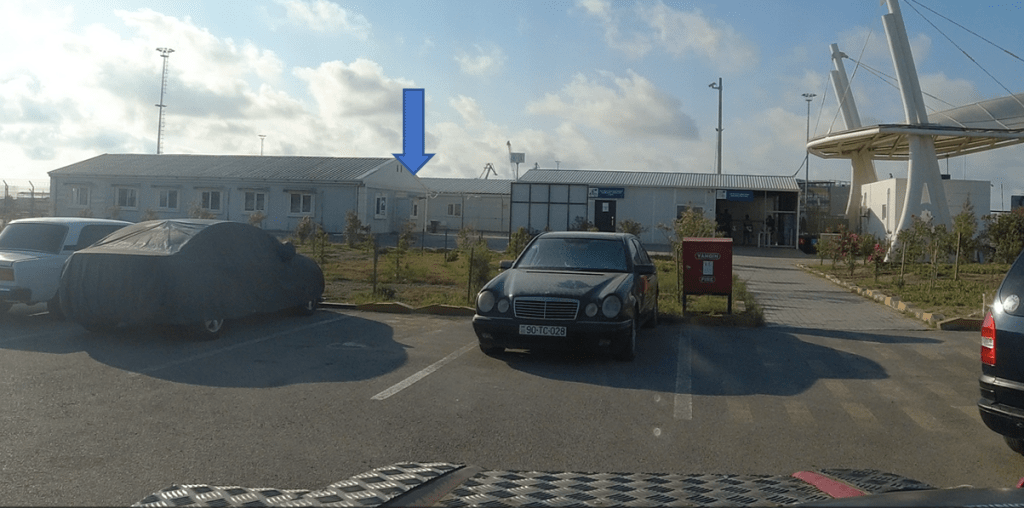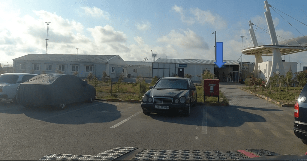 Gegen 16:30 ,Uhr Aufforderung zur Security zu gehen. Wieder am Schalter im Durchgangsbereich. Die Schranke öffnet sich. Als alle PKW Fahrer durch waren, ging es gemeinsam in den Innenbereich des Hafens. Henry steht in einem überwachten Bereich hinter Büschen im Schatten. Customs Clearance, erfassen der Daten vom Fahrzeug. In einer kleinen Hütte links vom Customs Gebäude entfernt, zahlt  man den Aufwand dafür von 35AZN. Zurück ins Gebäude und Versicherung für 4 Wochen abschließen. Den Beleg den man erhält zahlt man wieder in der kleinen Hütte, 72AZN.