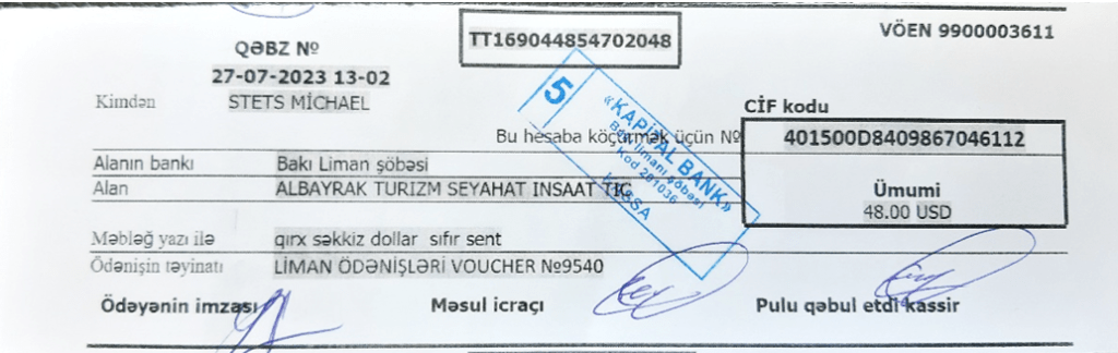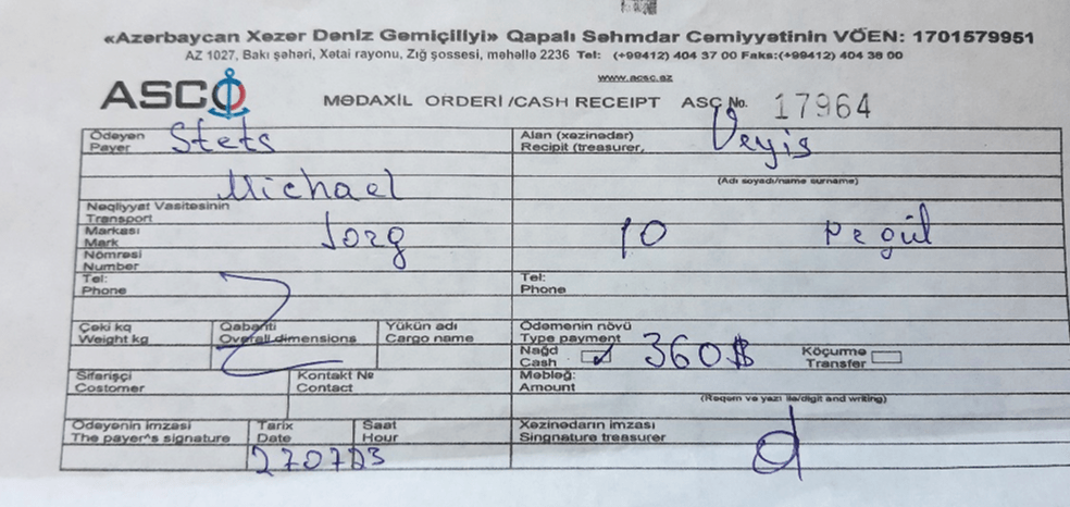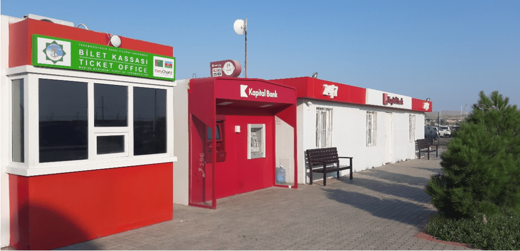 Mit der Liste die in Aktau erstellt wurde, wird das Fahrzeug anhand des Reisepasses identifiziert. Dann bekommt man das BOL Bill OF LANDING und ein Ticket über 360$. Mit beiden Dokumenten läuft man zur Bank, und begleicht am 2. Schalter die Forderung in $, €, oder Manat. Kreditkarten werden nicht akzeptiert, dafür gibt es aber einen ATM neben der Bank.