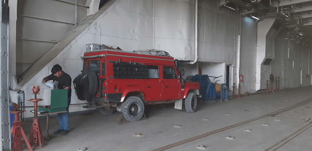 Ja, und jetzt glaube ich es, es gibt den Touribonus. Tür auf, reingeschaut, Stempel und gut. 2 Dokumente habe ich noch, eines davon gebe ich im Hauptgebäude ab, das andere behalte ich für die Fähre. Vor der Fähre wurde gegen 17 Uhr der ganze Wagen fotographiert, innen und außen, um für spätere Regressansprüche gewappnet zu sein.
