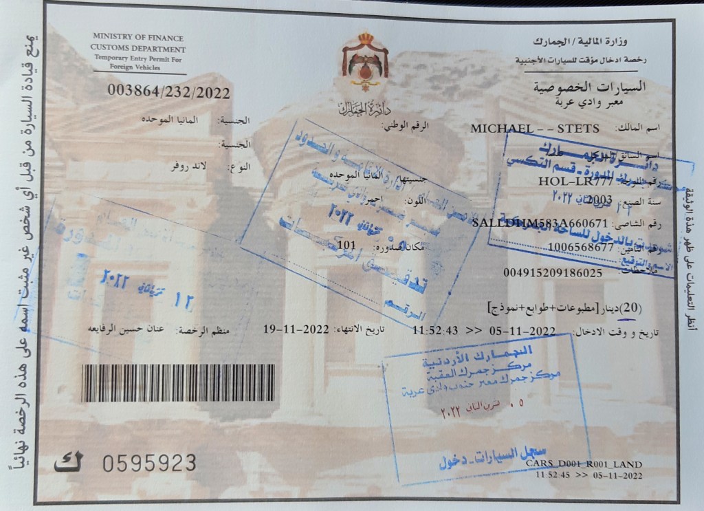Visa: Bei der Einreise mit dem eigenen Fahrzeug, muss das Visum zwingend im Heimatland beschafft werden. In Deutschland https://mfa.gov.jo/en/embassy/Berlin